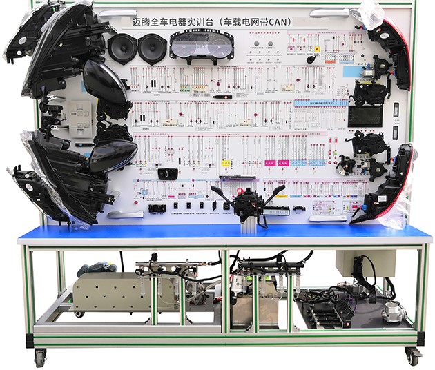 汽車電氣設備實訓室。汽車電器設備實訓室包含有汽車燈光系統(tǒng)、車載網絡系統(tǒng)、全車電器系統(tǒng)、汽車啟動系統(tǒng)、汽車空調系統(tǒng)、全車線路試驗臺、等實訓教學設備。該實訓室可以承擔《汽車構造》、《汽車電器設備》、《汽車電控系統(tǒng)》、《汽車檢測與診斷》等課程的實踐教學任務?梢杂糜谘芯、分析全車電器系統(tǒng)、燈光系統(tǒng)、儀表系統(tǒng)等電器設備的電路及功能。利用這些系統(tǒng)進行實踐教學,使學生熟悉汽車電器的結構和工作原理,掌握各個系統(tǒng)的基本組成電路,掌握主要電路的檢測方法和系統(tǒng)的故障特征,從而具有一定的檢測和調校能力。
