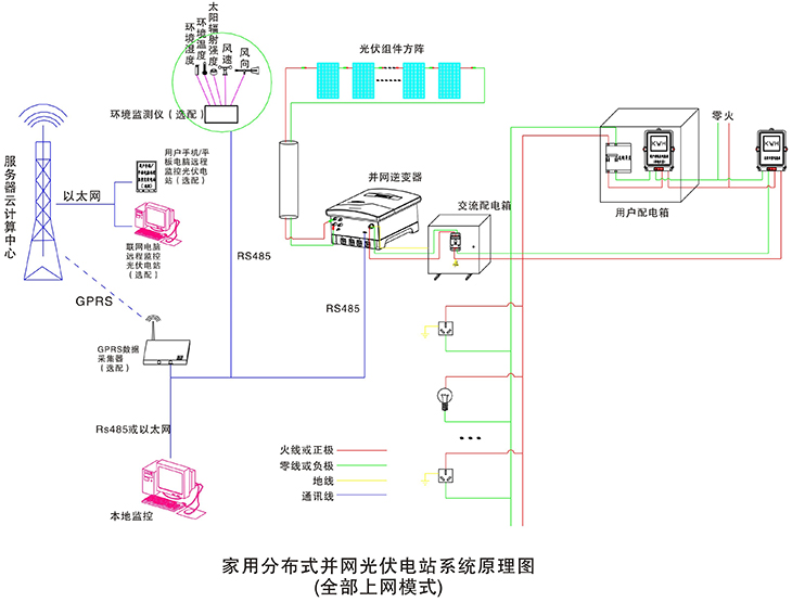 在晴朗的白天,裝在屋頂上的光伏組件發(fā)出的直流電經(jīng)過并網(wǎng)逆變器逆變成與電網(wǎng)同頻率同相位的單相交流電給負載進行供電,在夜晚或陰雨天等太陽光照不足的情況下,系統(tǒng)處于待機狀態(tài),負載用電全部來自電網(wǎng)。您可以通過系統(tǒng)監(jiān)控軟件來實時查看系統(tǒng)的運行狀態(tài)和故障信息,或者是選配遠程通訊數(shù)據(jù)采集器,將系統(tǒng)工作數(shù)據(jù)通過GPRS或以太網(wǎng),傳輸?shù)侥氖謾C、平板電腦或任意一臺聯(lián)網(wǎng)的電腦,以便于您遠程實時掌控電站的信息。