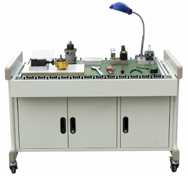 6、實訓臺:采用鈑金結構設計,表面為雙層亞光密紋噴塑工藝處理,臺面采用下凹設計,增加臺虎鉗,以及絕緣防滑墊,同時為液壓閥拆裝時提供一個良好的接油、防震平臺。