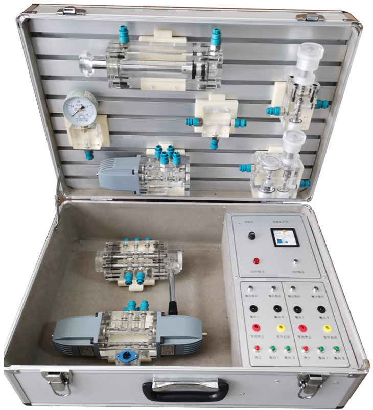 3、箱子集元件元件、液壓泵站、調(diào)速電機(jī)及電氣控制部分為一體箱,教師可方便的將設(shè)備帶入課堂進(jìn)行現(xiàn)場(chǎng)演示教學(xué)和實(shí)物講解。