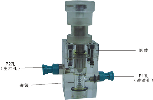 2、溢流閥結構上參考了國產P-63B型低壓直動式溢流閥,其閥體閥蓋、鎖緊螺母、調節(jié)螺母、螺塞等采用了進口透明有機玻璃材料精制而成,閥芯、調節(jié)桿采用了45#中碳鋼材料。并配合彈簧,油接頭,密封圈等標準件裝配而成,通過它可明確地觀察到閥芯、彈簧、油孔等結構及其運行過程,具有形象逼真,性能可靠等優(yōu)點。它即可作為教學模型,也可以作為液壓實驗元件進行實驗演示。