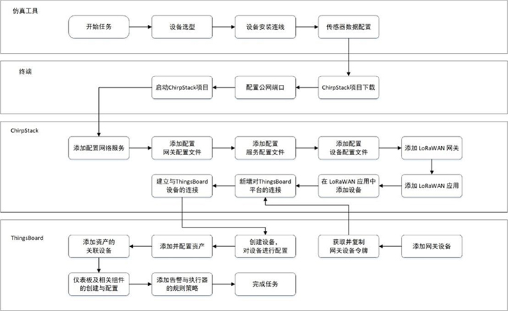 模擬智慧牧場(chǎng)系統(tǒng)還引入使用開(kāi)源軟件平臺(tái)ChirpStack與ThingsBoard,結(jié)合LPWAN技術(shù),實(shí)現(xiàn)遠(yuǎn)程低功耗數(shù)據(jù)采集、上報(bào)和展示。在ChirpStack平臺(tái)上,用戶(hù)可對(duì)網(wǎng)關(guān)、GPS、溫濕度傳感器等設(shè)備進(jìn)行配置,以上送仿真實(shí)驗(yàn)中的虛擬數(shù)據(jù)。在ThingsBoard平臺(tái)上,設(shè)置牧場(chǎng)地圖、告警信息、溫濕度等各儀表盤(pán)組件;獲取仿真設(shè)備上送的數(shù)據(jù),并將數(shù)據(jù)以圖表形式作可視化呈現(xiàn);以及基于流式編程添加相應(yīng)的規(guī)則策略,最終完成模擬智慧牧場(chǎng)實(shí)訓(xùn)場(chǎng)景的部署搭建。