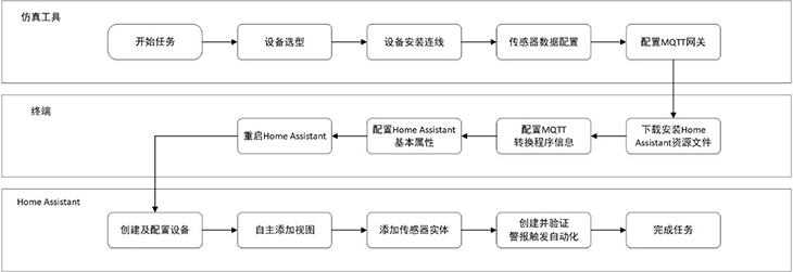 圖:智能家居課程案例,使用自動(dòng)化智能家居平臺(tái)Home Assistant,對(duì)安裝好的感知層設(shè)備進(jìn)行數(shù)據(jù)的瀏覽和各種自動(dòng)或手動(dòng)的執(zhí)行操作。