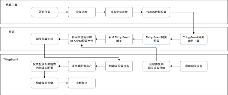 智慧溫室案例,引入了ThingsBoard IoT Gateway開(kāi)源解決方案,在AIoT平臺(tái)的仿真工具中部署ThingsBoard gateway網(wǎng)關(guān),以連接ThingsBoard云平臺(tái),便于上送溫濕度傳感器數(shù)據(jù),搭建恒溫機(jī)執(zhí)行器模塊;ThingsBoard平臺(tái),用戶(hù)可在儀表盤(pán)內(nèi)添加設(shè)置智慧溫室場(chǎng)景、溫濕度顯示設(shè)備等組件,獲取仿真實(shí)驗(yàn)中上送的虛擬數(shù)據(jù),以動(dòng)態(tài)曲線(xiàn)的形式作可視化呈現(xiàn);用戶(hù)還可根據(jù)案例要求,在ThingsBoard平臺(tái)的規(guī)則鏈庫(kù)中,自主編輯設(shè)定規(guī)則引擎,實(shí)現(xiàn)智慧溫室的恒溫控制與異常告警。