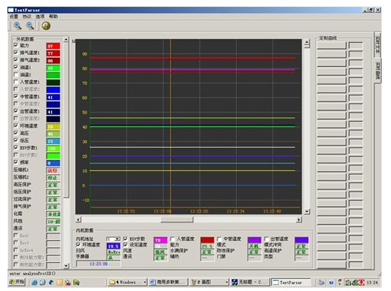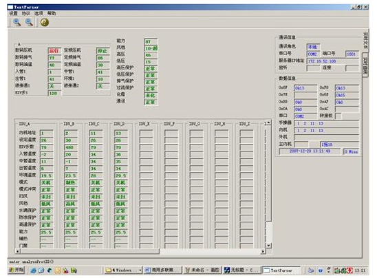 中央空調(diào)機(jī)由于工程復(fù)雜,設(shè)備分散,有的已經(jīng)裝修在開花板上測試程序,一但出現(xiàn)了故障,工程量相當(dāng)大,為了能夠快速準(zhǔn)確地測出故障是由主機(jī)機(jī)組還是室內(nèi)機(jī)的故障的,每個(gè)生產(chǎn)廠家根據(jù)生產(chǎn)的和維修的需要而開發(fā)了中央空調(diào)測試程序?蓽y試壓縮機(jī)的運(yùn)轉(zhuǎn)頻率,傳感器的各種數(shù)據(jù),電子膨脹閥的工作步數(shù)等幾十種中央空調(diào)的工作數(shù)據(jù)和狀態(tài),軟件可實(shí)現(xiàn)對(duì)內(nèi)機(jī)的控制,,可以對(duì)1-64臺(tái)內(nèi)機(jī)的狀態(tài)進(jìn)行設(shè)定。是高校提供了好的研究的學(xué)習(xí)設(shè)備。